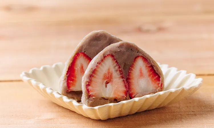 西荻窪【越後鶴屋】が天狐の為にきび糖で作った餡と求肥で旬のあまおう苺を包みました。体に優しく深みのある味わいを楽しめます。