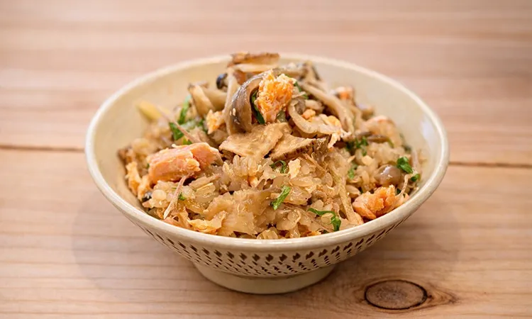 炊き込みご飯に香味野菜と鮭を混ぜ込み、食感のいいいぶりがっこを載せています。