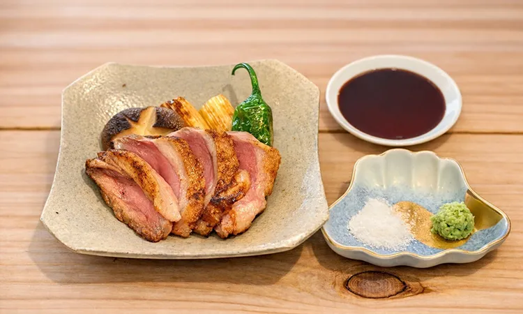 低温調理で中までじっくり火入れし、自家製のタレにつけて炭火で香ばしく焼きました。自家製の焼き鳥のタレと無添加のろく助の塩で。