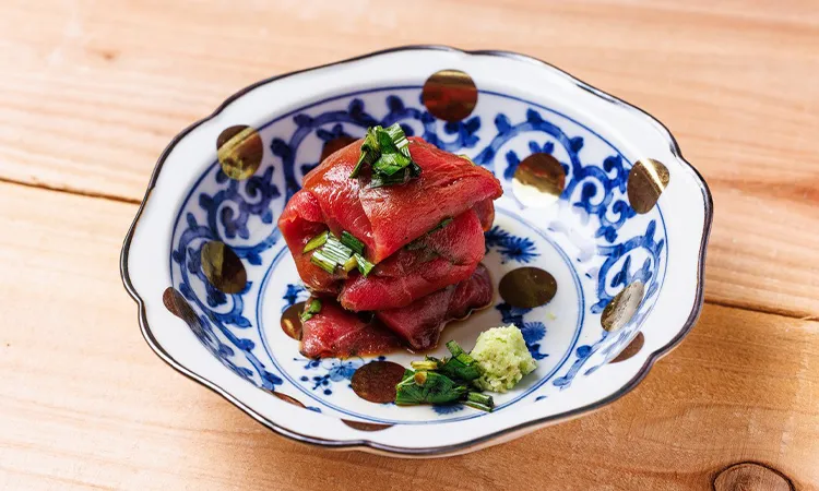 ミシュラン寿司店御用達のやま幸のマグロ。ニラの香りと醤油のコクが絶妙に調和した逸品です。