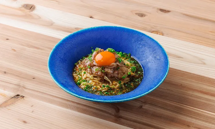 和牛サーロインをすき焼き風に煮込んだ贅沢な逸品。たっぷりの卵黄が絡んだ蕎麦と一緒にお召し上がりください。